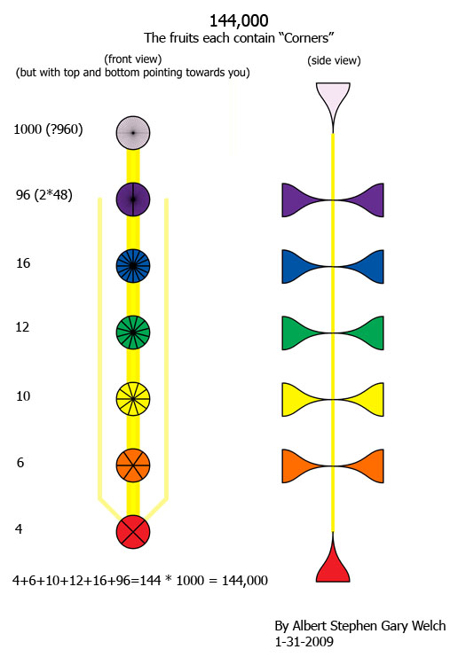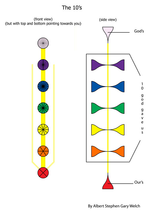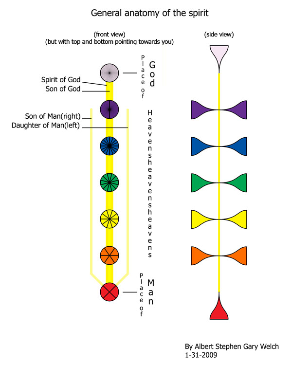 Above, we have a general representation of the spirit which can be asspciated with many beliefs from the New Age, Kundalini Yoga, Chritianity, among myths and others. What we have is an assortment of rainbow colored "fruits" that function as different areas of consciousness which are connected by pathways or rivers. With relationship to the Bible, the man and woman are at the sides only able to "eat" from the "heavens", while the forbidden fruit of "God" is out of their reach. But the pathway of the "Son of God" is not existant as an "expanse" while we are impure. But through purity, the Son of God will rise up from the from the place of Adam(name refering to terms for red and land), through the "midst" and in the "likeness of God" to the 7th level, or the 12th fruit. Concepts relating to energy must have been known to them, I am not saying electricity. But the terms of male and female refer to the rivers as to wherter they carry this energy from us or to us. The masculine carries the energy from us to the higher levels of our being to express our thoughts. While the female percieves the thoughts from the parts of our being that is above us. But the Son of God resprsents a union of male and female where there is no conflict of thoughts, which is like a bidirectional pathway. I would guess that some of this is done so that we can not bring utter chaos to what God has created, by causing these things to be seperated within us while we are impure. But when we become pure, we can percieve and comprehend more, and to understand the ramifications of what we do if we are given spiritual gifts. But this does not mean that we can not gain the ability to use them unless we are totally pure, but merely lack control and understanding to use them wisely and correctly until then. Please be aware that I am just describing the inner dynamics of our spiritual being and these relates to the quality of morality and judgements of Good and evil, but there are external forces which may also affect ourselves just as much. But we are the real creators of what is within us, and most of us not able to comprehend this at this time. The Spirit of God is supposedly responsible for keeping our entire spiritual being into existance. And we can never say that we are without him, just unaware of him. As you see or the righthand side, there are 7 levels, but when you look on the lefthand side, these are the 12 fruits. The rising of the Son of God up through each level is to be considered a "day". Also this is just a simple diagram overview of some of the basics.